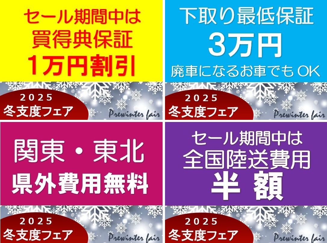 『冬支度フェア』 期間限定の4大特典サービス付き! 開催期間 令和7年11月7日(金)〜11月30日(日) ○特典1 『買得典保証1万円割引』 ○特典2 『下取り最低保証3万円』 ○特典3 『関東・東北県外費用無料』 ○特典4 『全国陸送費用半額』 詳細はフェア&イベント情報をご確認ください。